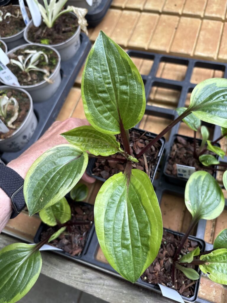 Hosta Avocado Toast. Denne hosta har grønne, rynkede blade med gule kanter. Bladstilkene er mørk røde.