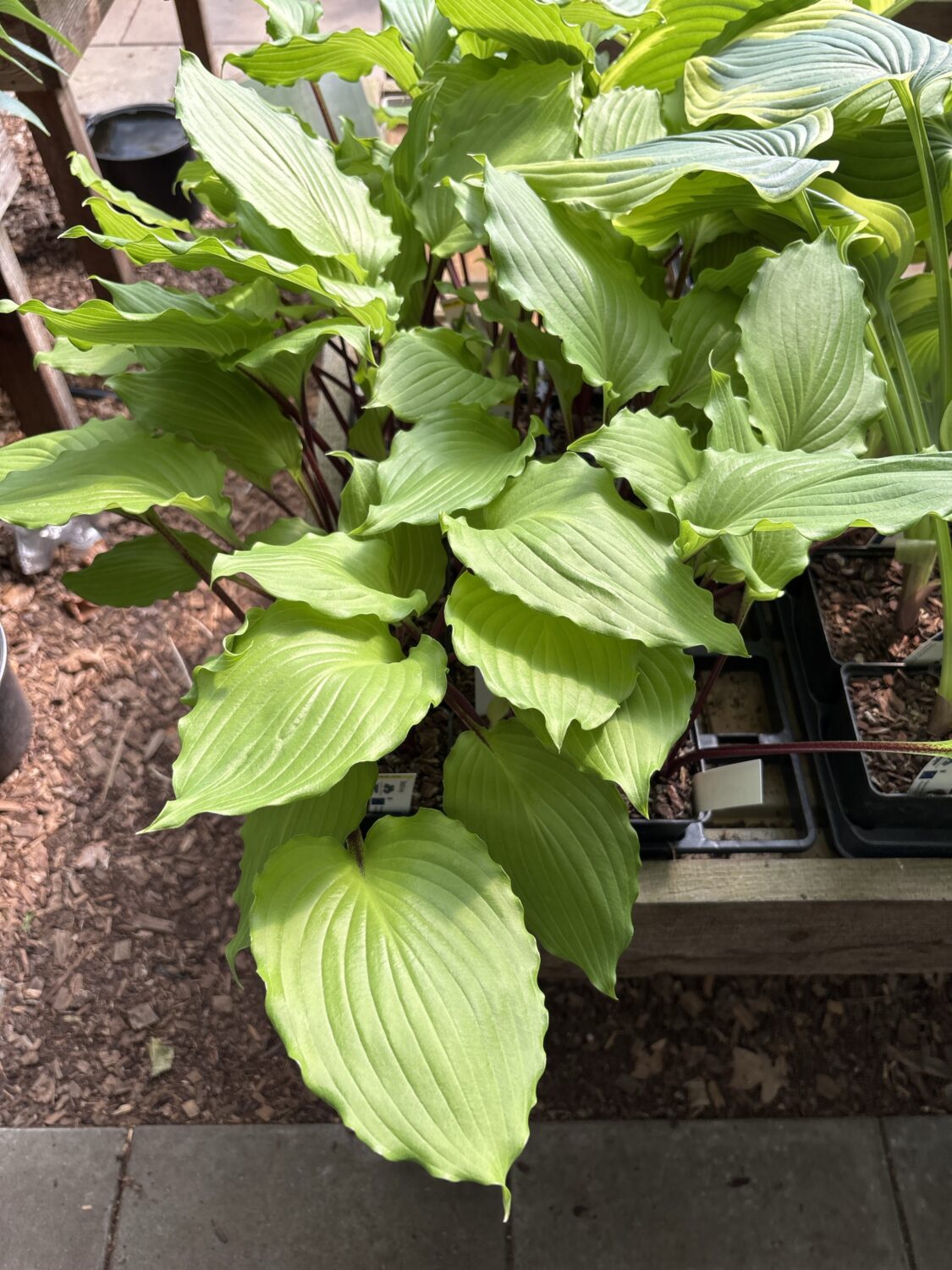 Hosta Bricks’n Ivy. Denne hosta har kraftige, snoede og skinnende mørkegrønne blade med en kraftigt kruset kant, holdt på lilla bladstilke.
