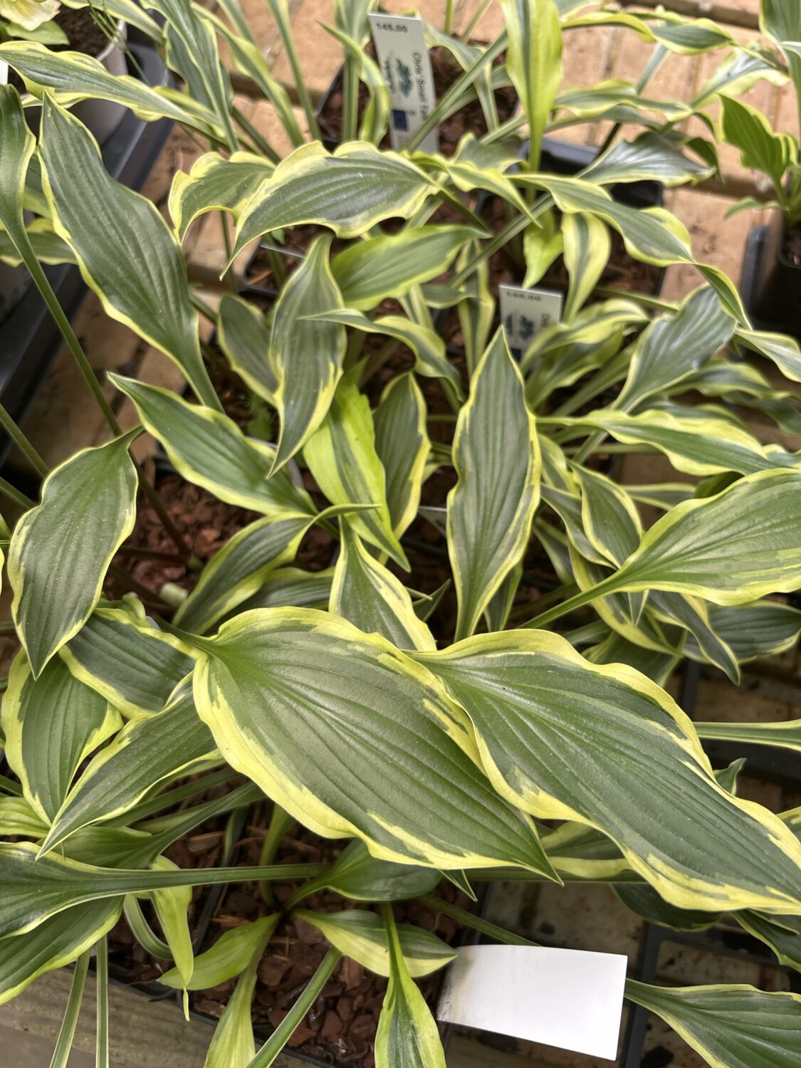 Hosta Chris’ Small Talk. Denne hosta har aflange, smalle blanke grønne blade med gule kanter, der hurtigt bliver cremehvide. Flotte lilla røde bladstilke og hurtigt voksende.