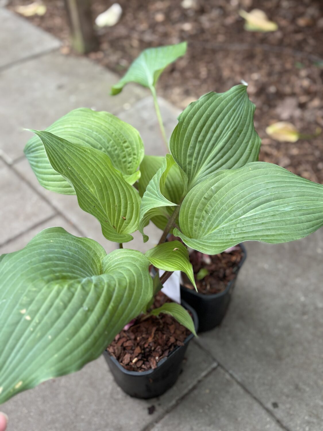 Hosta Dragon’s Eye. Denne hosta har frostgrønne blade, der er hvide under bladet. Bladstilkene er røde/lilla