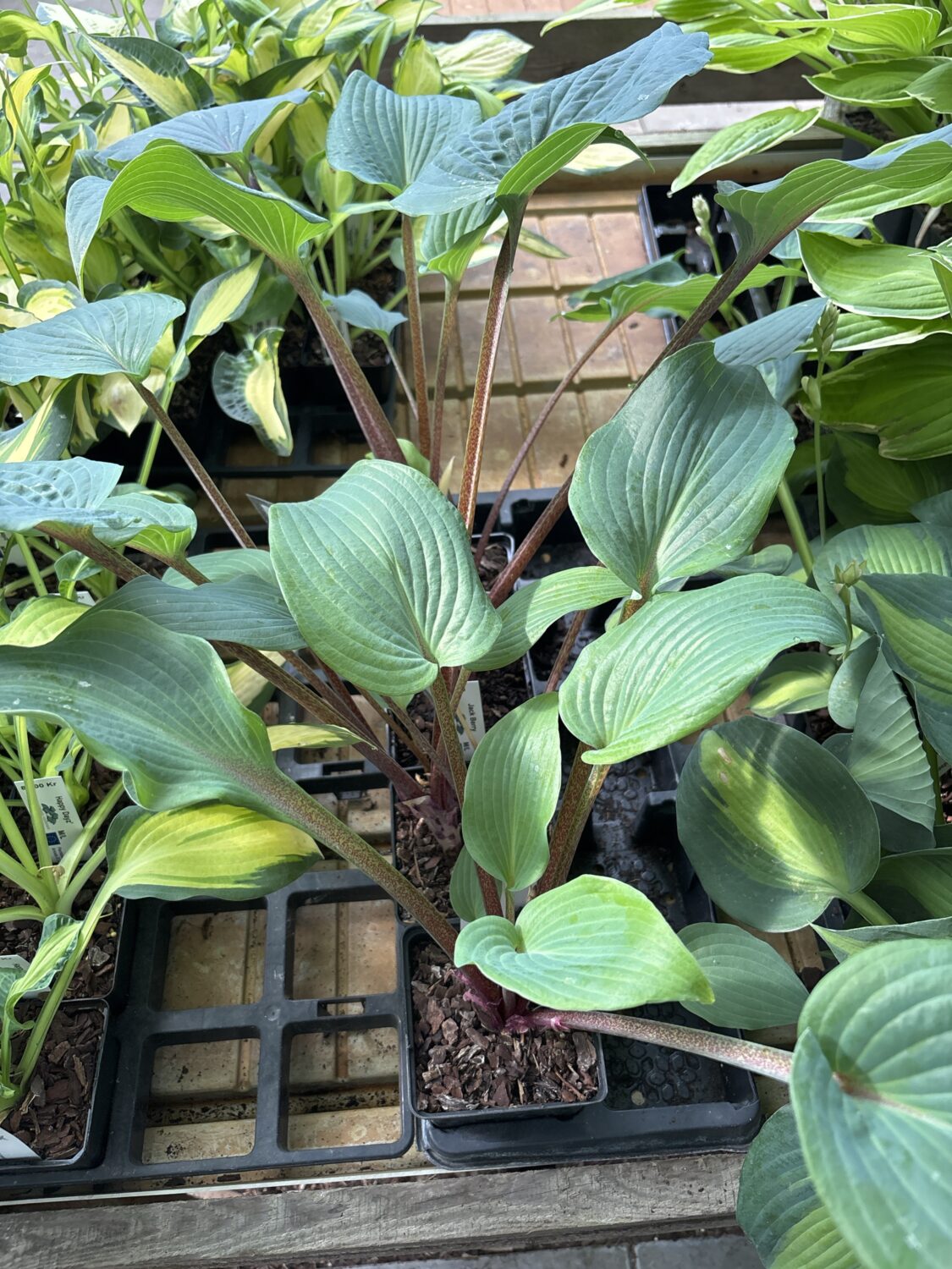 Hosta Jack Berry. Denne hosta har metalliske blå blade med røde bladstilke og røde årer på toppen og undersiden af bladene