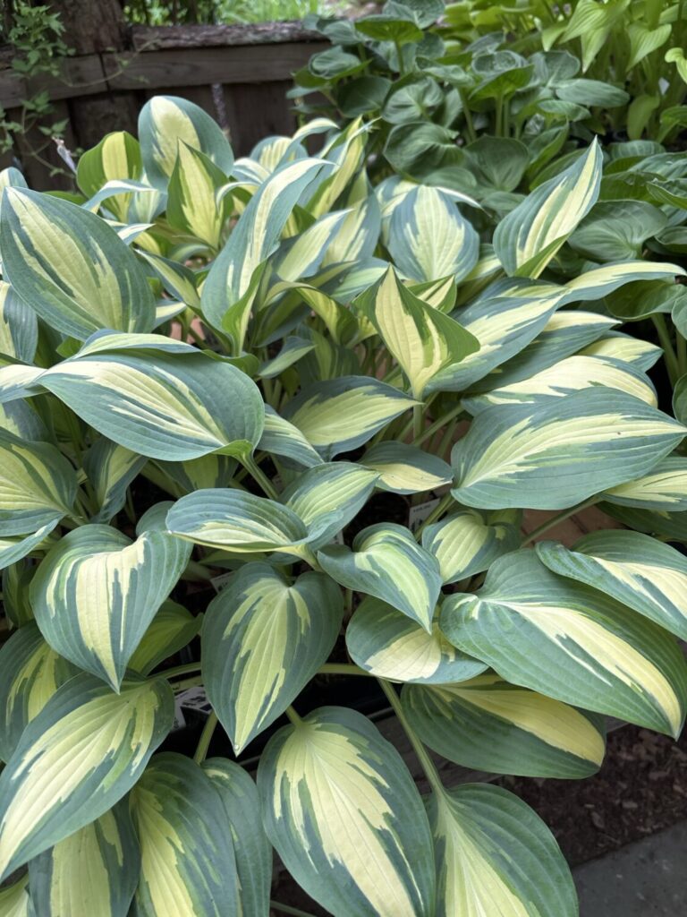 Hosta Little Angel Wings. Denne hosta har Lange og smalle cremehvide blade med en blågrøn kant. Denne hosta ligner “Moonstruck” men forbliver mindre i størrelsen.