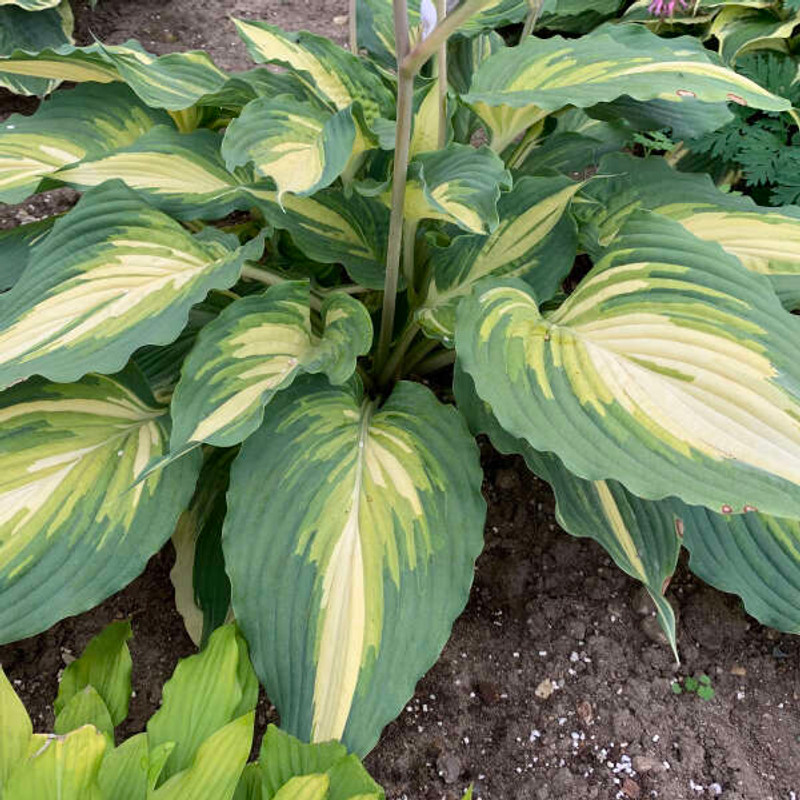 Hosta Love Story. Denne hosta har cremegule blade med brede blå kanter, der er kraftigt bølgede.