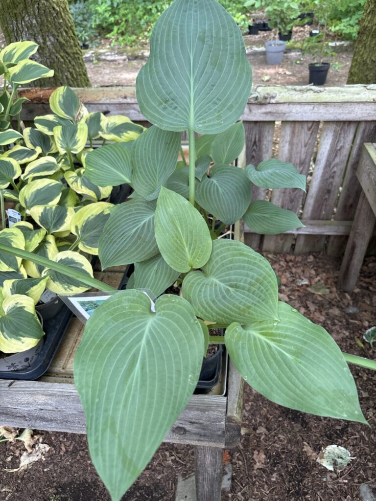 Hosta Marmalade on Toast. Denne hosta har store hjerteformede blå blade. Blå blade holdes altid pænest blå hvis de er i skygge. Denne hosta er en hurtigvoksende sport af “Orange Marmelade”