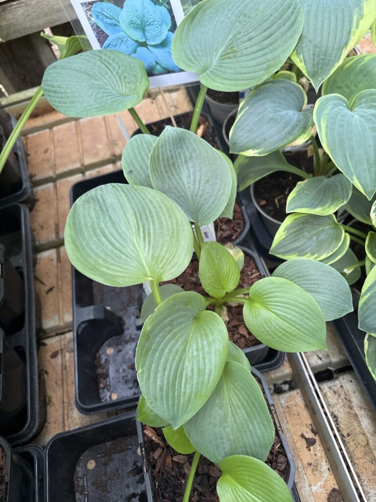 Hosta Mohegan. Denne hosta har store blå runde og rynkede blade.