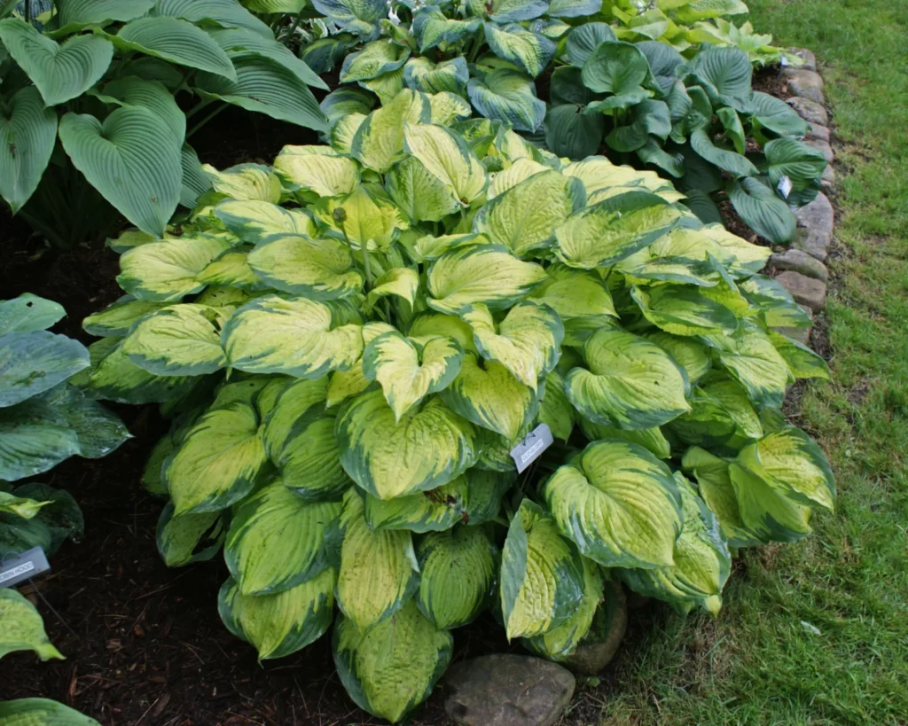 Hosta Old Glory. Denne hosta har hjerteformede gule blade med en mørkegrøn kant