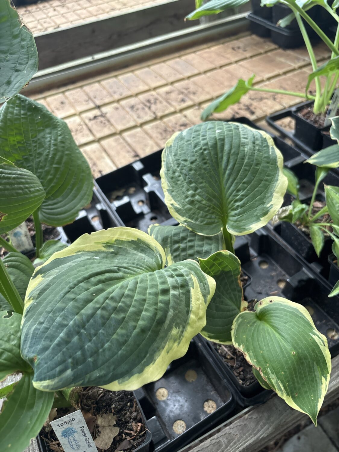 Hosta Pizzazz. Denne hosta har blågrønne blade med en creme gul kant. Bladet er skålformet og bliver koppet.