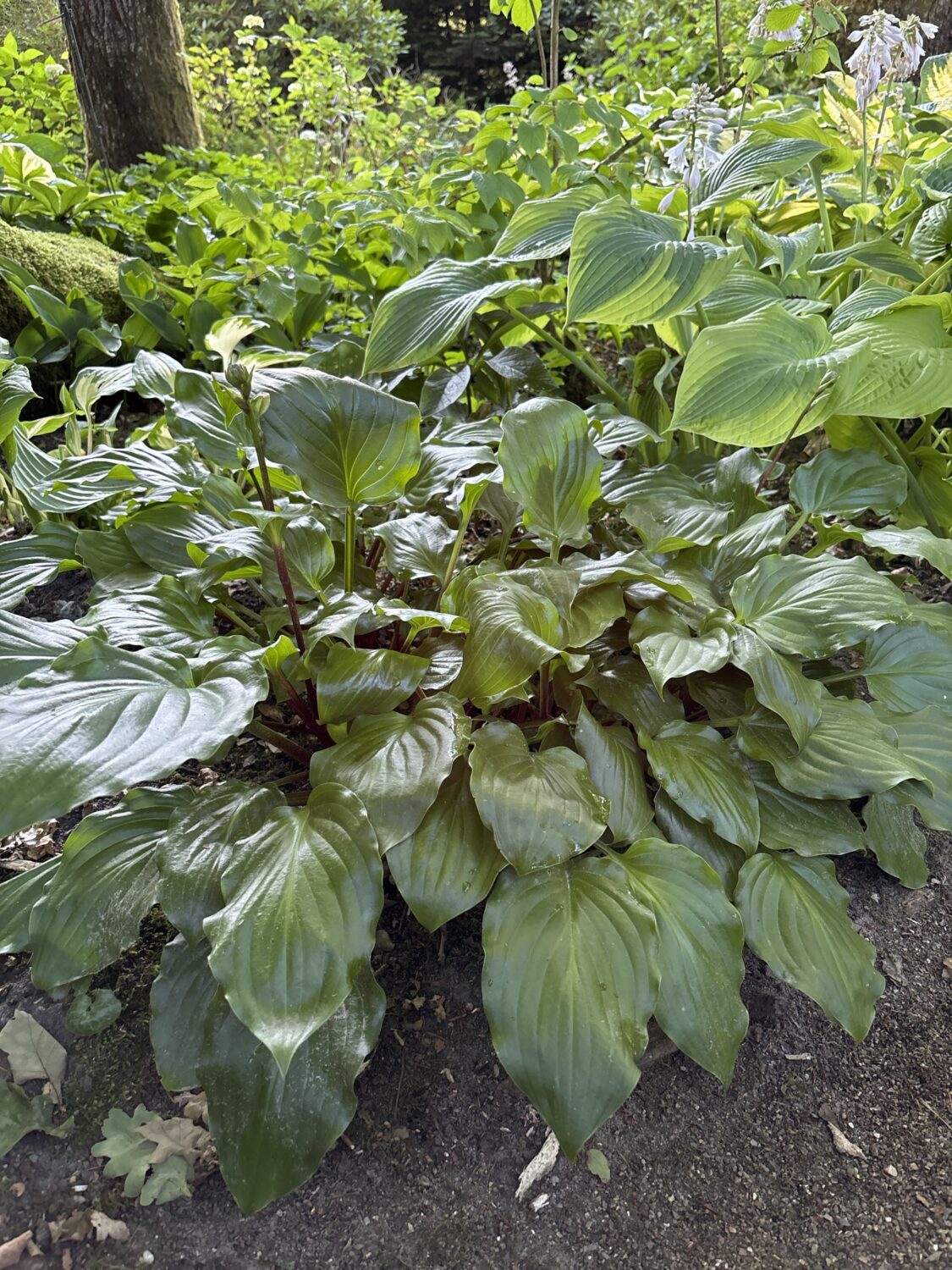 Hosta Red Stepper. Denne hosta har smukke blanke helt skinnende blade med røde blomsterstængler.