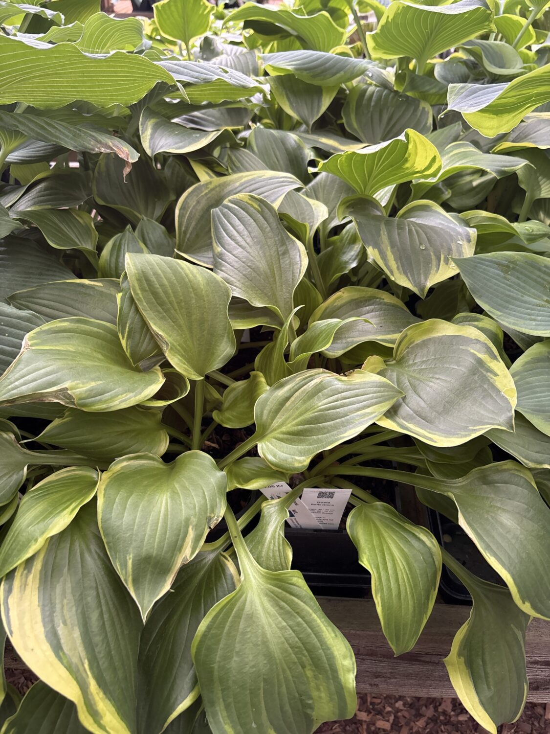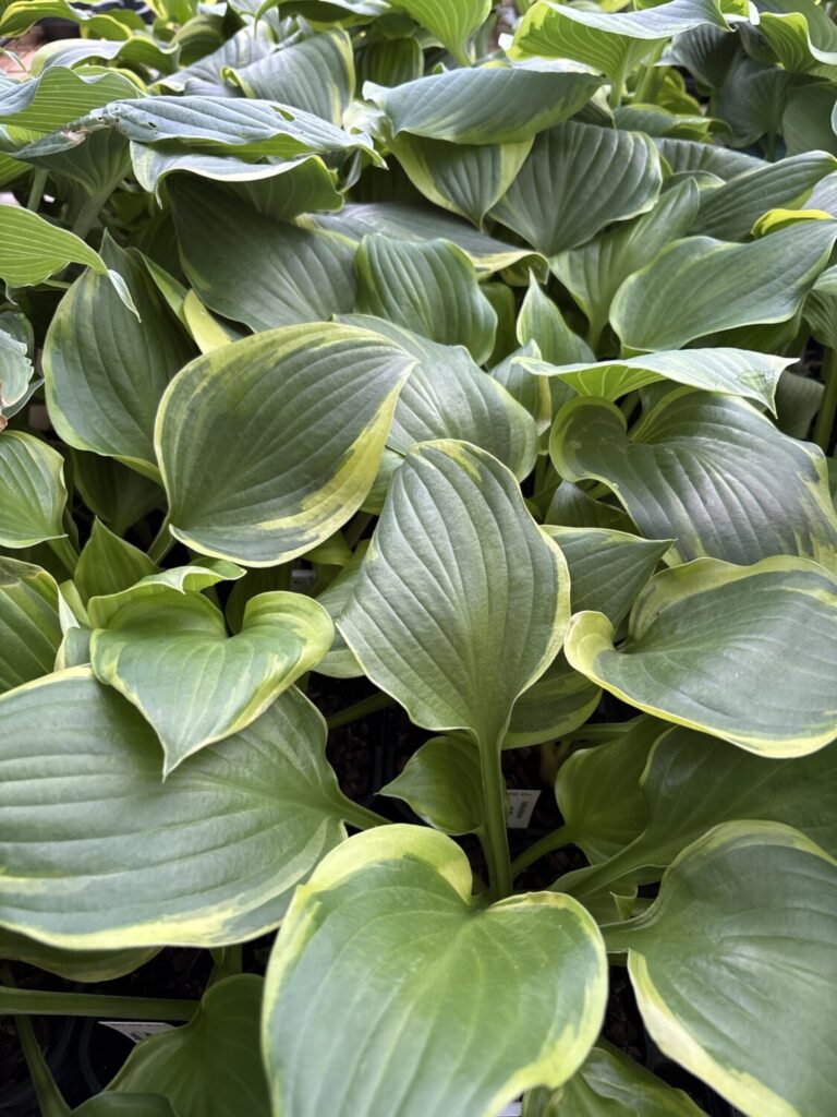 Hosta Reflections. Denne hosta har næsten runde grønne blade. Kanten er bred og uregelmæssig. Cremefarvet kant.