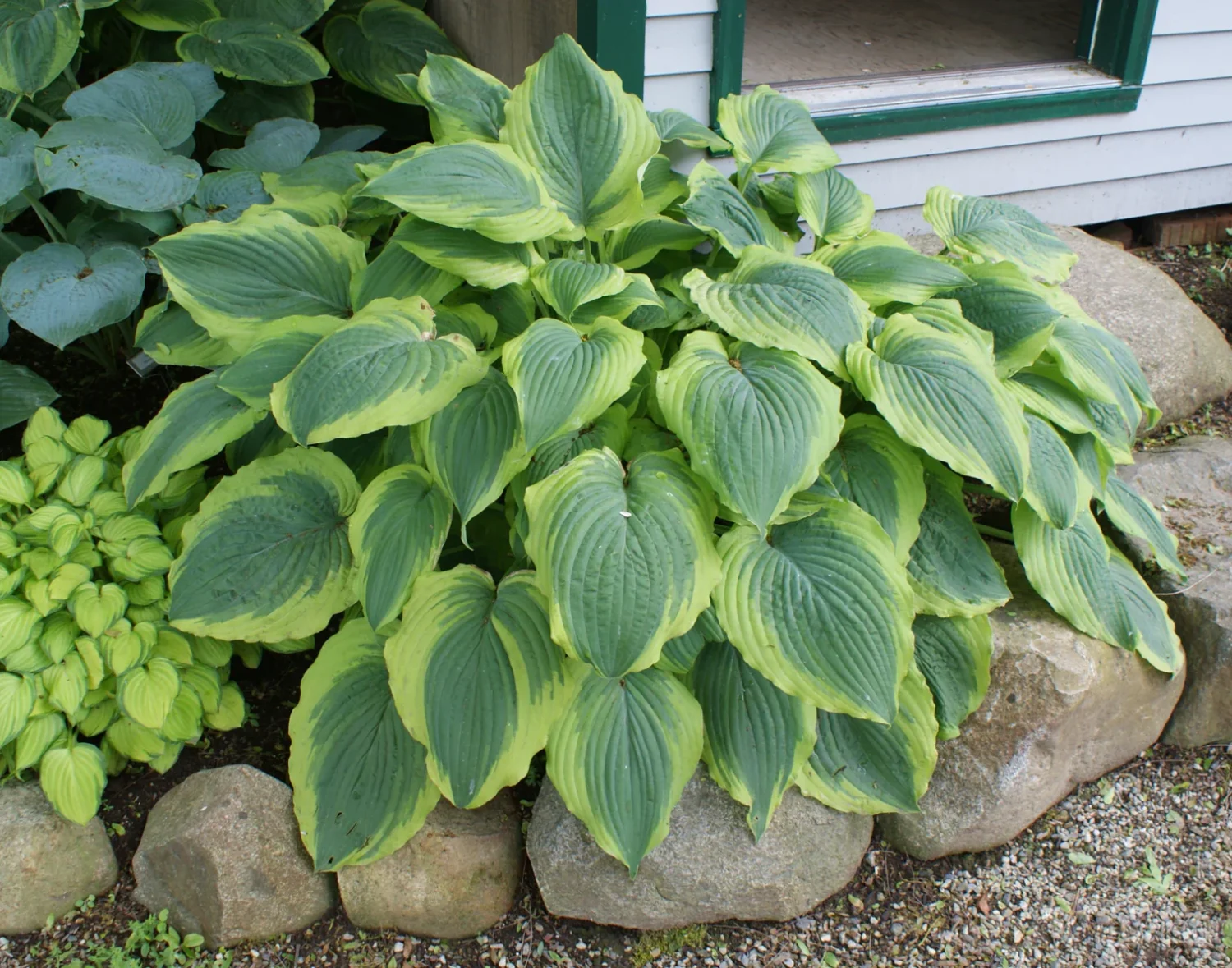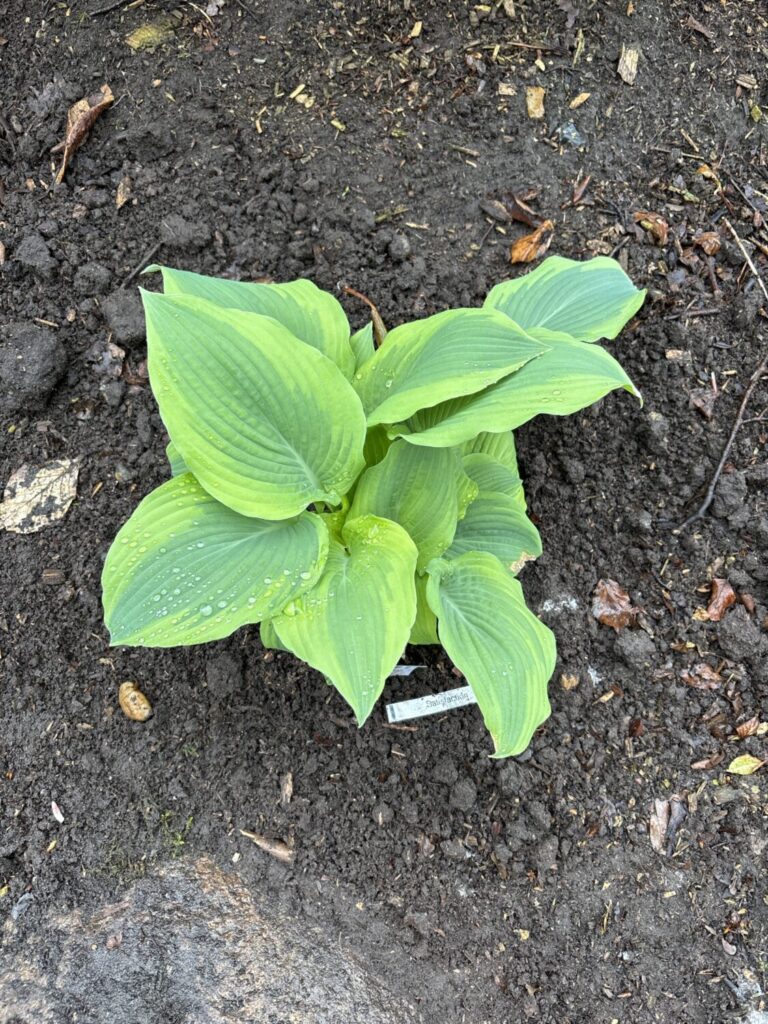 Hosta Satisfaction. Denne hosta har hjerteformede blade. Mørkgrønne med en gul kant.