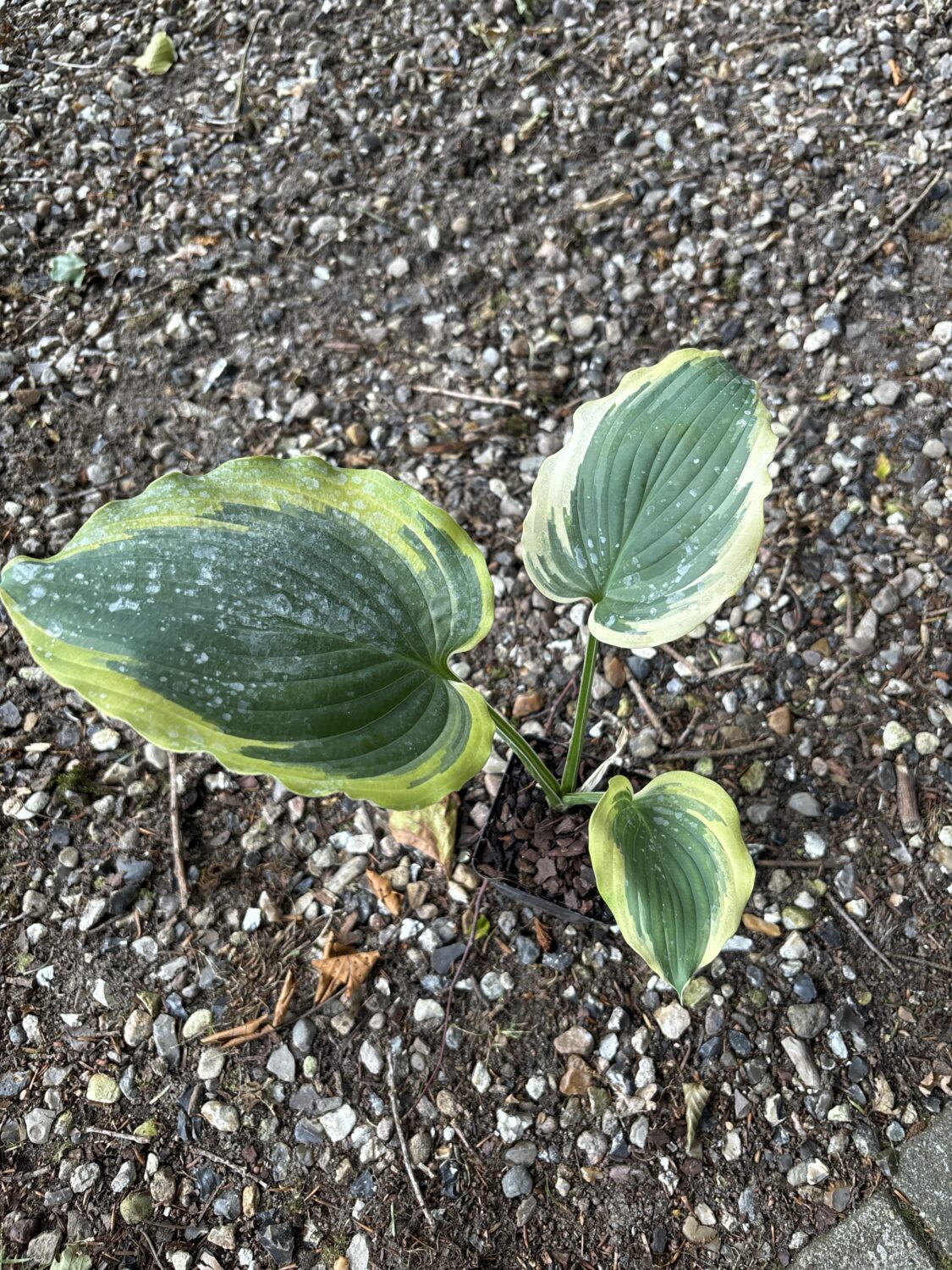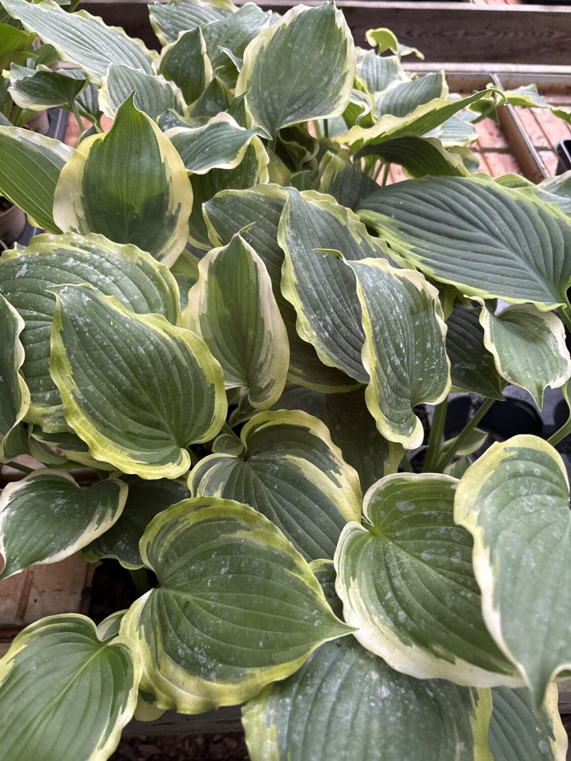 Hosta Seducer. Denne hosta har hjerteformede grønne blade med en gulliggrøn kant, midte og kant er adskilt af en hvid linje.