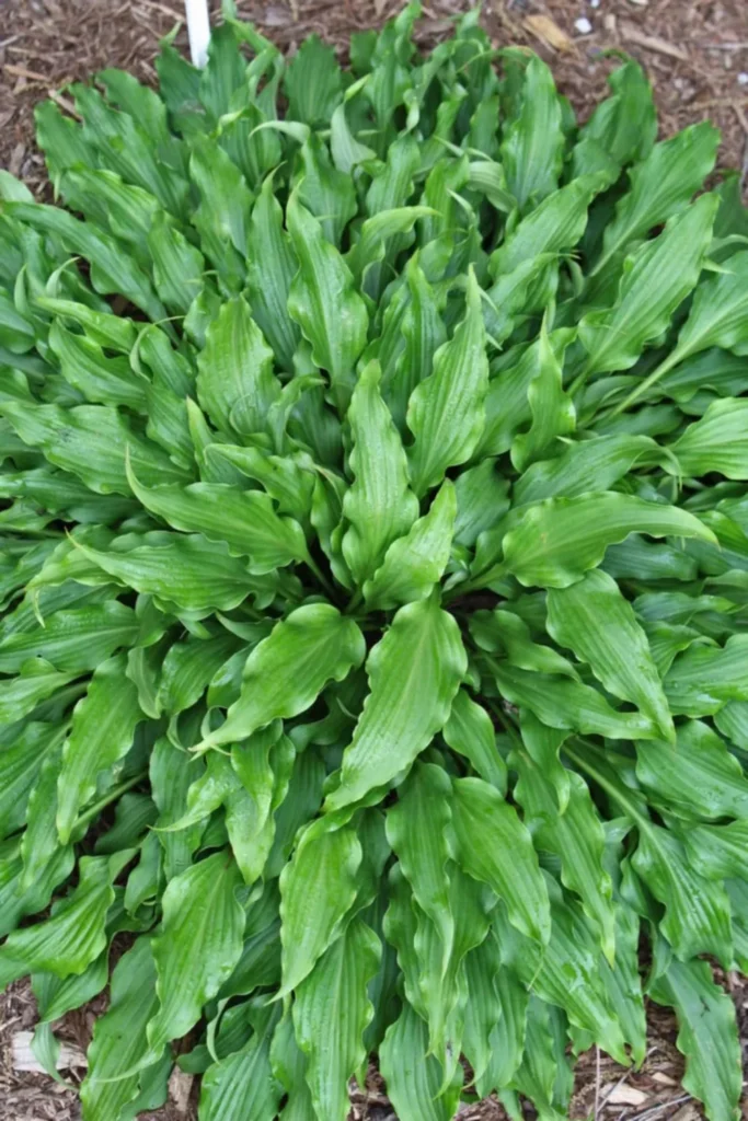 Hosta Tongue Lashing. Denne hosta har smalle, skinnende mørkegrønne blade med bølgede kanter. Den kommer med mange blomster