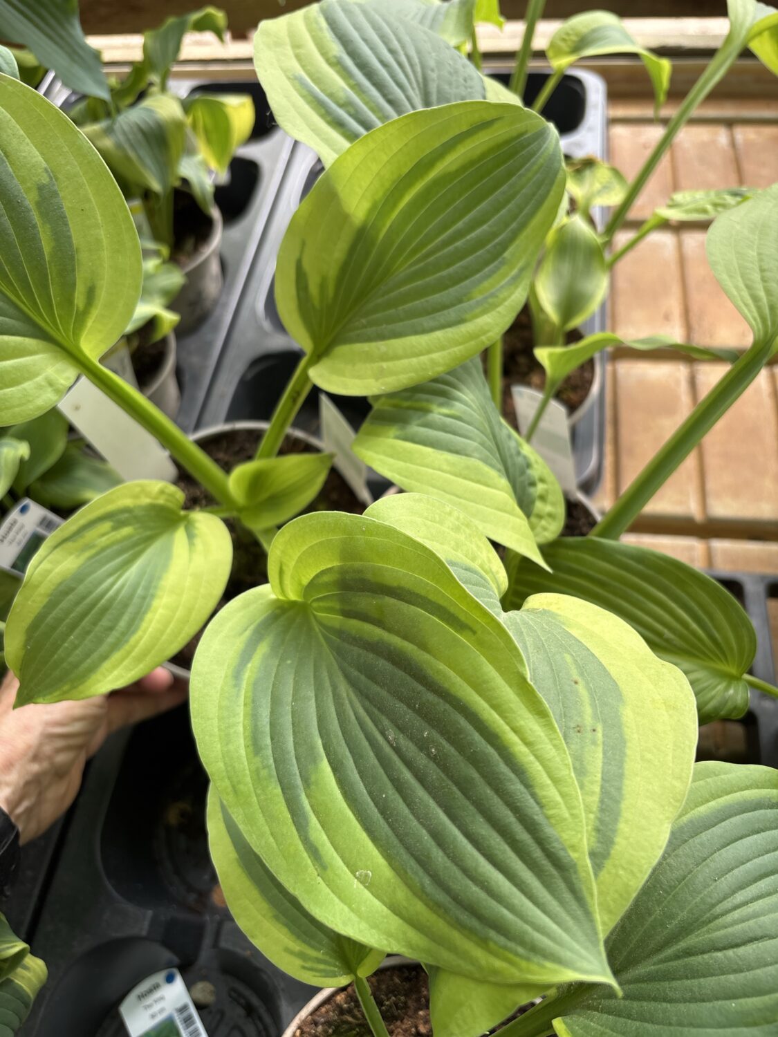 Hosta Velvet Moon. Denne hosta har et mørk grønt blad med meget bred gul kant.
