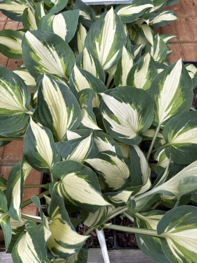 Hosta Vulcan. Denne hosta har cremehvide blade med en bred grøn kant. Midten er omkranset af grønlige striber.