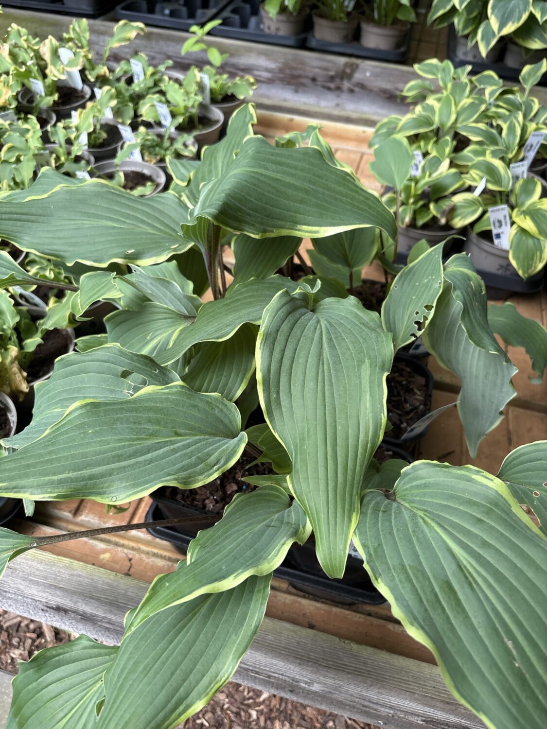 Hosta White Linen. Denne hosta har grønne blade med cremet kant. Kanten ændrer farve til hvid senere på sæsonen. Bladene holdes på røde bladstilke.